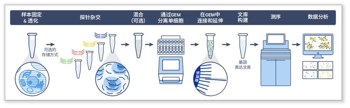 單細胞Fixed RNA為10x Genomics于2022年3月推出的新產(chǎn)品,采用4%的PFA對細胞進行固定,鎖定RNA的表達狀態(tài),建庫時通過探針雜交捕獲基因,可覆蓋18,000多個基因,解決了單細胞樣本儲存、多樣本批量處理以及混樣測序的問題,讓單細胞轉(zhuǎn)錄組的研究更加靈活。