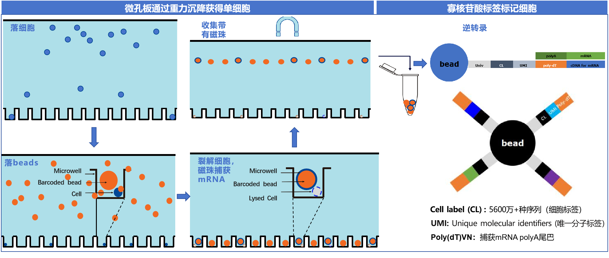 微孔板上有超過26萬個微孔,利用重力沉降的原理依次加入細胞和beads,由于微孔數(shù)和beads數(shù)遠遠高于細胞數(shù),從而微孔板上成千上萬了微孔內(nèi)部存在一個細胞和一個磁珠,微孔內(nèi)細胞裂解,磁珠捕獲mRNA(beads上存在標記細胞(CL)和RNA分子(UMI)的標簽,以及帶有poly(dT)的寡核苷酸鏈,poly(dT)捕獲mRNA的polyA尾巴),后續(xù)基于磁性收集磁珠(帶有RNA分子),進行逆轉(zhuǎn)錄,將細胞和RNA分析標簽加到每一個RNA分子上,以達到細胞標簽標記細胞,UMI進行RNA定量的目的。
