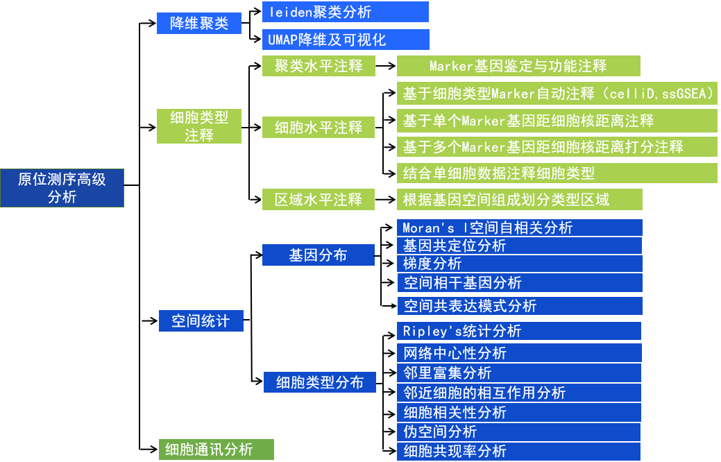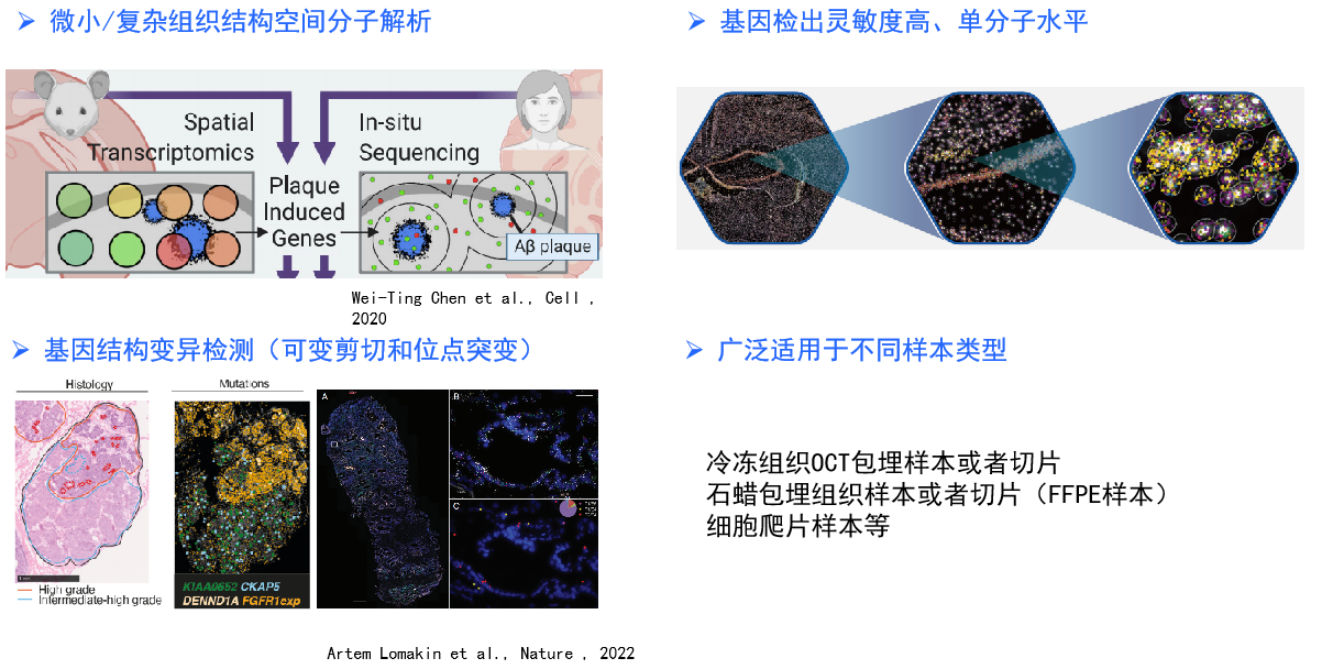 (5)圖像分析:獲得每個靶基因在組織中的空間表達位置,用不同符號(或顏色)標記在同一張組織圖像中;通過細胞邊界識別等方法得到單細胞水平的基因表達定量數據,可進行高級分析