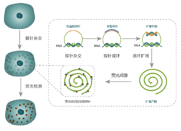 (2)探針雜交與滾環(huán)擴增:探針與RNA雜交之后連接成環(huán),通過滾環(huán)擴增放大信號;