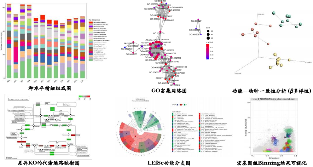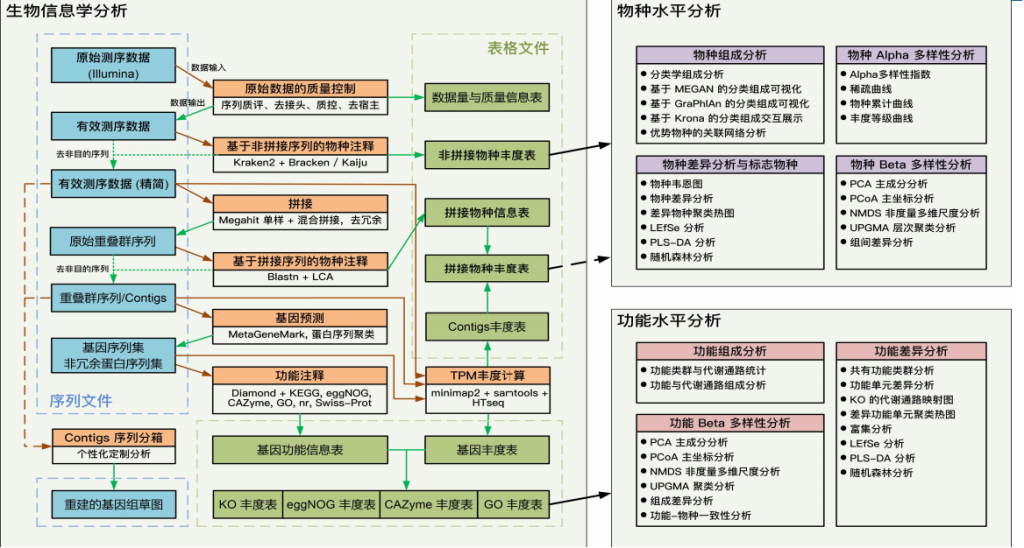 宏基因組學(Metagenomics)研究通過全基因組鳥槍法(Whole Genome Shotgun,WGS)測序策略,將提取獲得的微生物組總DNA隨機打斷為短片段,并構建合適長度的插入片段文庫,對這些文庫進行雙端(Paired-end,PE)高通量測序,從而能精細地展示整個菌群的功能代謝譜和物種精細組成譜,進而在組成和功能水平分別挖掘關鍵生物標記物,從原理上闡明微生物群落在生態系統中發揮作用的根本機制。